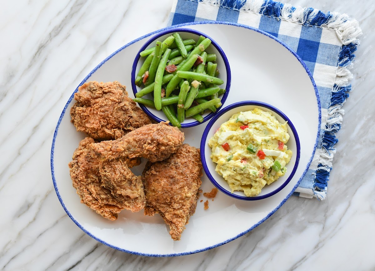 Southern Fried Chicken with Mac N Cheese and Green Beans